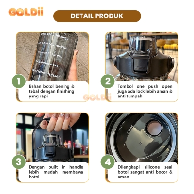 Tetap segar dan terhidrasi setiap saat dengan Goldii Botol Minum Jumbo 2 Liter! Botol ini hadir dalam desain transparan yang stylish, kapasitas super besar, dan dilengkapi dengan tali gantung serta sedotan silikon yang nyaman. Terbaik untuk digunakan di rumah, kantor, gym, sekolah, maupun saat berpetualang!