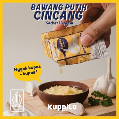 Bawang Putih Cincang siap masak ini bikin aktivitas memasak kamu jadi lebih praktis! Nggak perlu khawatir bawang cepat busuk, karena Kuppila bisa tahan sampai 12 bulan saat kemasan belum dibuka. Gak perlu repot mengupas atau memotong bawang, dan yang terpenting, tangan kamu juga nggak bakal bau bawang setelahnya. Cocok banget untuk kamu yang ingin memasak lebih cepat dan efisien! 1 sachet berisi 18 gram, cukup untuk 2 porsi. PIRT no : 2093578020396-27, HALAL: ID35110001580311122.