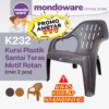 Mau nongkrong di teras sambil ngepoin tetangga? Kursi Santai K232 ini adalah solusi terbaik! Desainnya yang ergonomis dan nyaman bikin kamu betah berlama-lama, bahkan bisa ketiduran saking nyamannya.Dengan ukuran 75x58,5x70 cm dan kapasitas maksimum 125 kg, kursi ini terbuat dari bahan plastik premium yang tebal dan awet. Ada dua pilihan warna, Coklat Tua dan Coklat Muda, yang siap menambah keindahan teras atau tempat nongkrong kamu.Kenapa harus pilih Kursi K232? ✅ Tahan lama sampai 10 tahun bahkan lebih! ✅ Desain internasional, pas banget untuk ukuran orang Indonesia. ✅ Material berkualitas, kokoh dan tidak mudah patah.Ideal untuk: ✅ Warung Kopi ✅ Kafe ✅ Teras Rumah ✅ Angkringan ✅ KostanJangan lupa cek stok sebelum order ya! Dan kalau belanja banyak, bisa dapat potongan harga lho. Hubungi kami untuk info lebih lanjut.Selamat berbelanja!