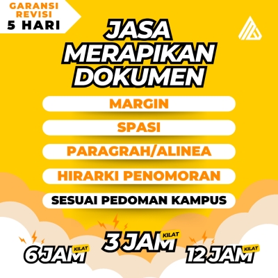 Kesulitan merapikan dokumen? Tenang, kami hadir untuk membantu! Pesan layanan penyusunan dokumen di sini. Sebelum melakukan checkout, jangan lupa untuk membaca informasi ini ya!Perhatikan harga yang tertera, karena itu bukan harga final. Pastikan untuk chat kami terlebih dahulu agar pesanan bisa disesuaikan dengan kebutuhan Anda. Misalnya, jika Anda ingin membuat daftar isi dengan harga yang disepakati sebesar 20K, tinggal lakukan checkout sesuai jumlah yang disetujui (contoh: 20x untuk 20K).Sebelum checkout, pastikan Anda memperhatikan hal-hal berikut: