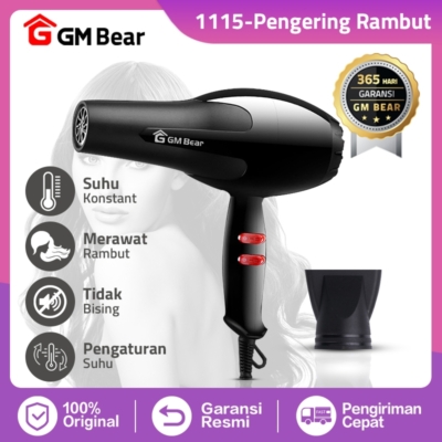 Sambut kehadiran Pengering Rambut GM Bear 1115, solusi sempurna untuk merapikan dan mengeringkan rambut Anda dengan cepat! Dengan motor bertenaga, hair dryer ini bikin kegiatan styling rambut jadi lebih efisien, menghemat waktu dan tenaga Anda. Desainnya yang kompak juga memudahkan Anda untuk membawanya saat bepergian. Dengan teknologi EHD yang inovatif, panasnya tersebar merata sehingga rambut tetap terjaga kelembapannya. Tersedia tiga pengaturan suhu dan dua pengaturan angin, membuatnya sangat mudah untuk mendapatkan hasil yang diinginkan.**Keunggulan Produk:** - Harga terjangkau dan berkualitas - Desain minimalis yang chic dan praktis - Tombol pengaturan suhu: Normal, Hangat, dan Panas - Tombol pengaturan angin: Angin Sedang dan Angin Kencang - Kabel dengan ketebalan ekstra untuk keamanan - Dilengkapi pengait praktis untuk menggantung - Kepala nozzle yang dapat dilepas dan dipasang - Konsumsi daya rendah, performa tinggi**Spesifikasi:** - Bahan: Nylon + ABS - Daya: 120 - 694 Watt - Tegangan: 220V - Frekuensi: 50Hz - Kabel Panjang: 95cm - Size: 28 x 25 x 11cm - Berat: 400gr - Box kemasan terbaru berwarna coklatCara menggunakan: Aktifkan tombol pengaturan angin terlebih dahulu sebelum mengatur suhu.Dapatkan produk berkualitas dari GM Bear dengan garansi resmi selama 1 tahun! Perhatikan petunjuk penggunaan untuk menjaga keselamatan saat menggunakan produk. Tersedia di GM Bear Surabaya untuk area Jawa Timur dan GM Bear Medan untuk area Sumatera.**Catatan penting:** Pengajuan komplain harus dilengkapi dengan video buka kemasan jika terdapat masalah. Pesanan diproses dari Senin sampai Sabtu.