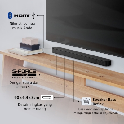 Rasakan pengalaman menonton yang lebih mendalam dan imersif dengan Sony HT-S100F, soundbar 2 channel dengan speaker Bass Reflex yang siap memanjakan telinga Anda. Desainnya yang ramping dan elegan membuatnya cocok untuk berbagai gaya interior rumah.Fitur Unggulan: